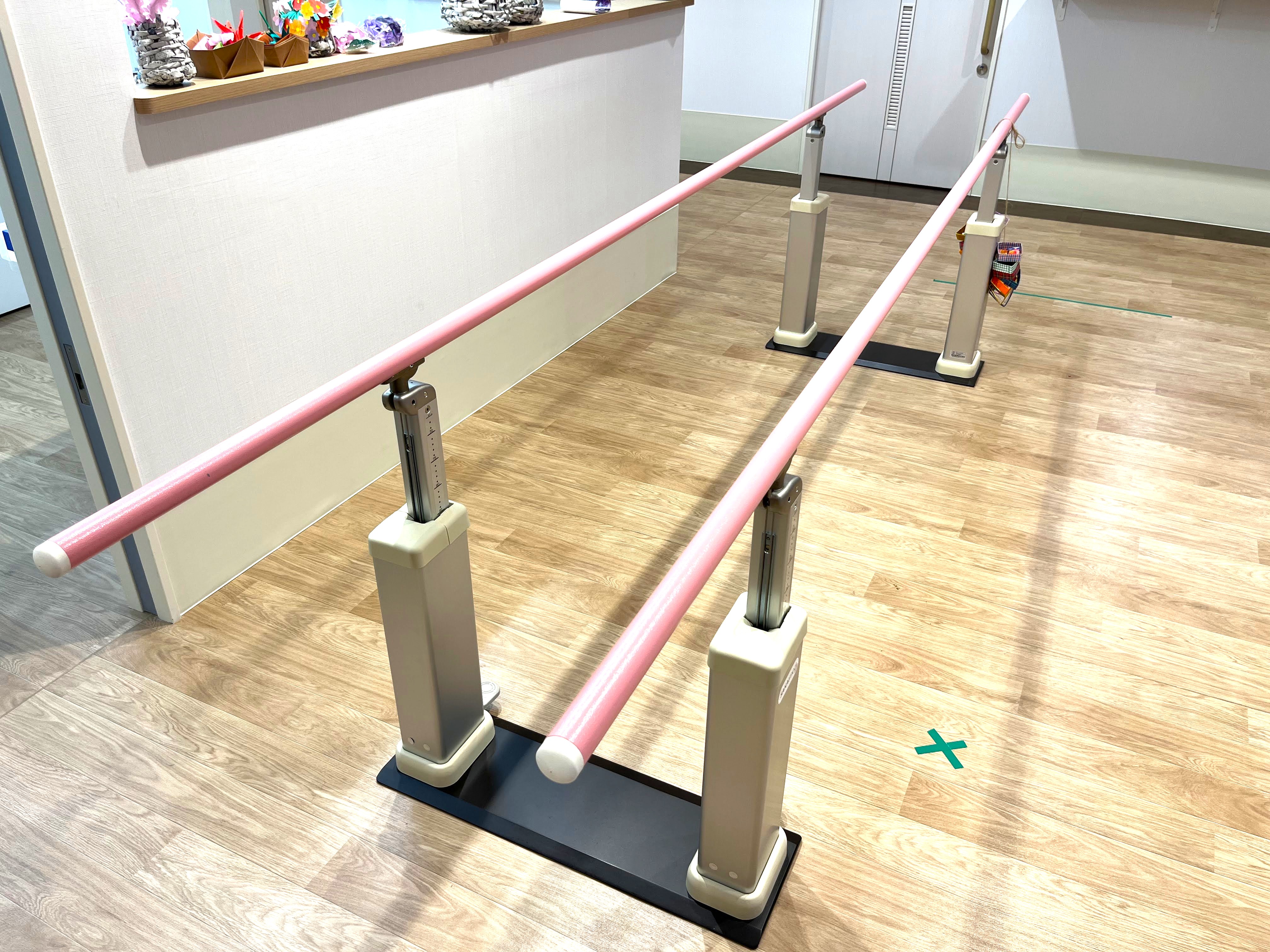 歩く力を取り戻したい・転ばない体づくりをしたいという皆さまに向けて、 平行棒を使った安全で効果的なトレーニングを行っています。歩行や立ち座り動作に必要な筋力・バランス感覚を鍛えるための訓練用器具です。しっかりと両手で握れるので、足元が不安な方でも安心して取り組めます。