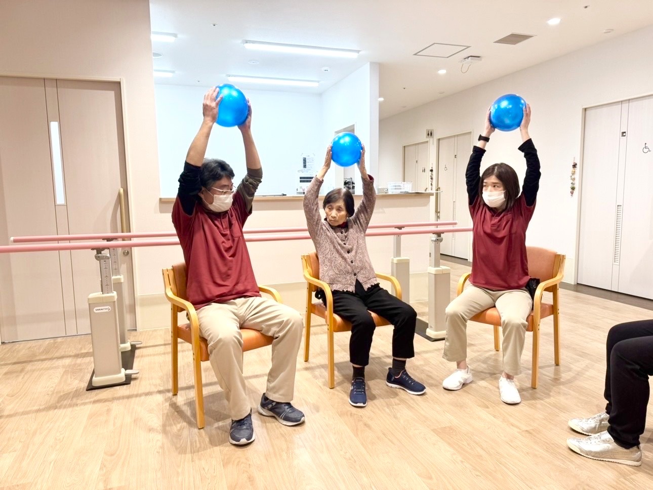 軽くて扱いやすいボールを使って、腕や肩、体幹の筋力維持・柔軟性アップを目指す運動や音楽やリズムに合わせて行う体操もあり、笑顔あふれる雰囲気で継続しやすい内容です。 スタッフも一緒に参加し、和やかな雰囲気の中で自然と体が動き出す、そんな時間です。